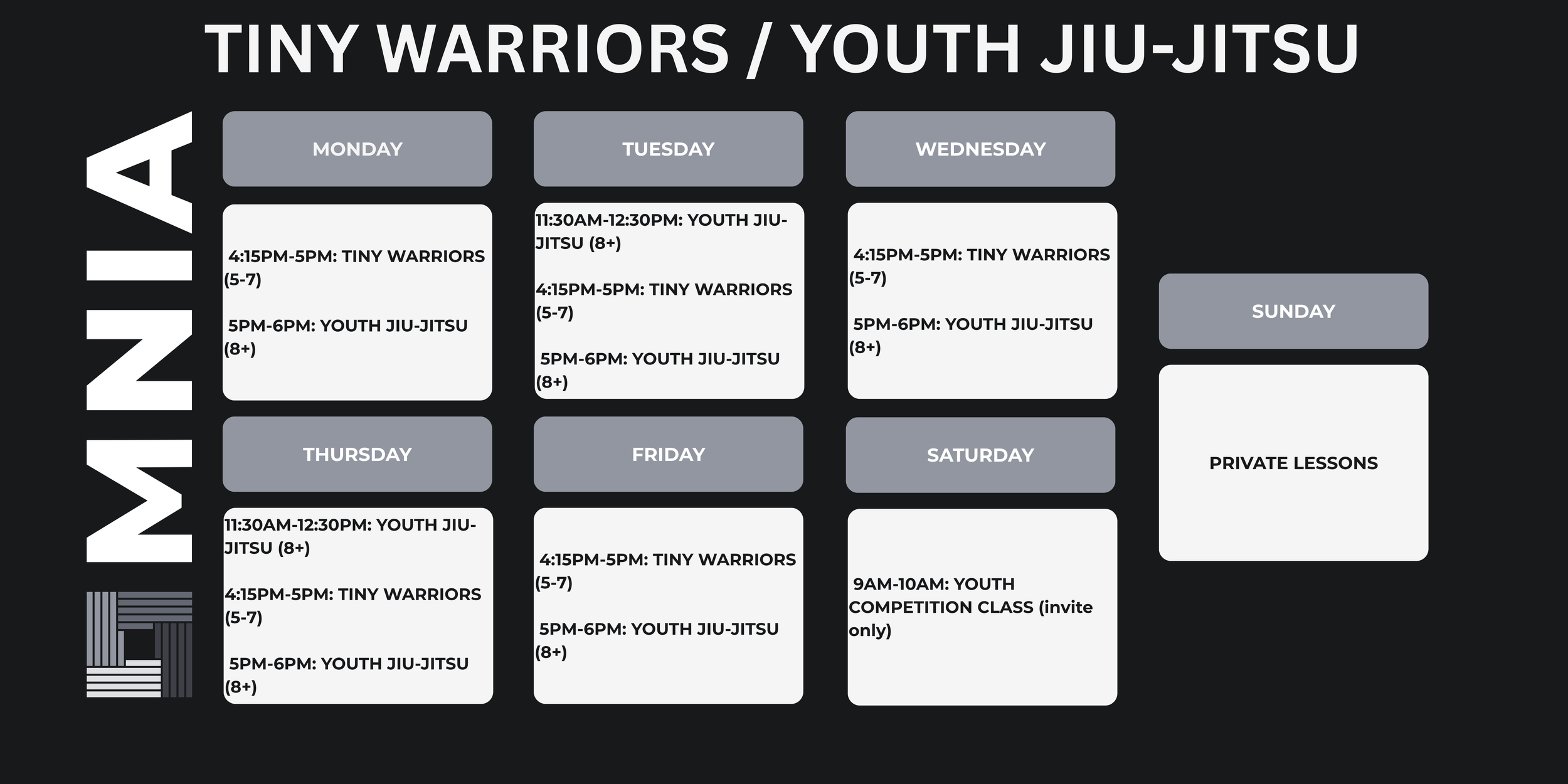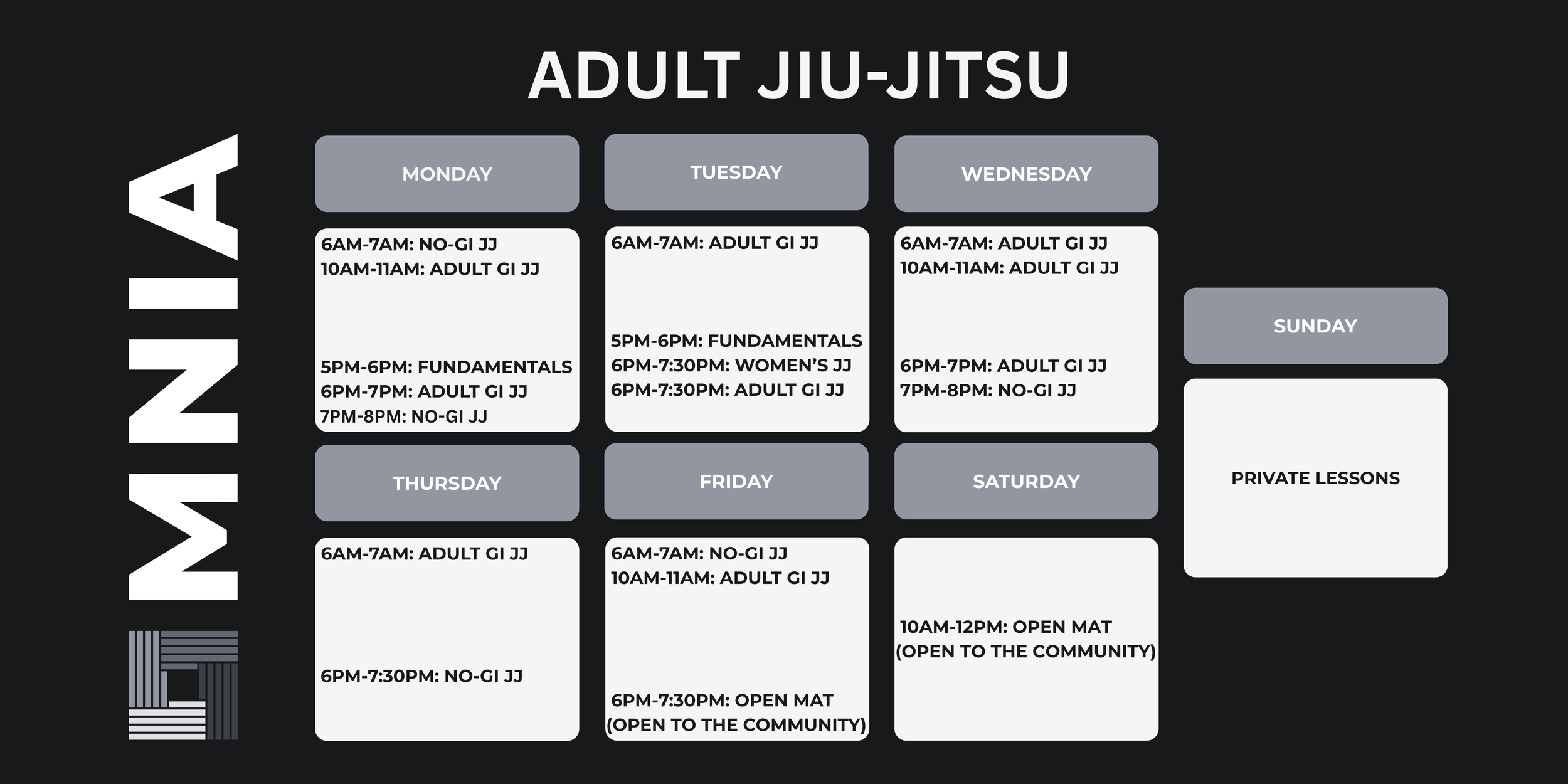 We offer classes for kids and adults six days a week. Our schedule at launch is just the beginning. As the team grows, early afternoon and pro training sessions will be added to elevate our training environment.